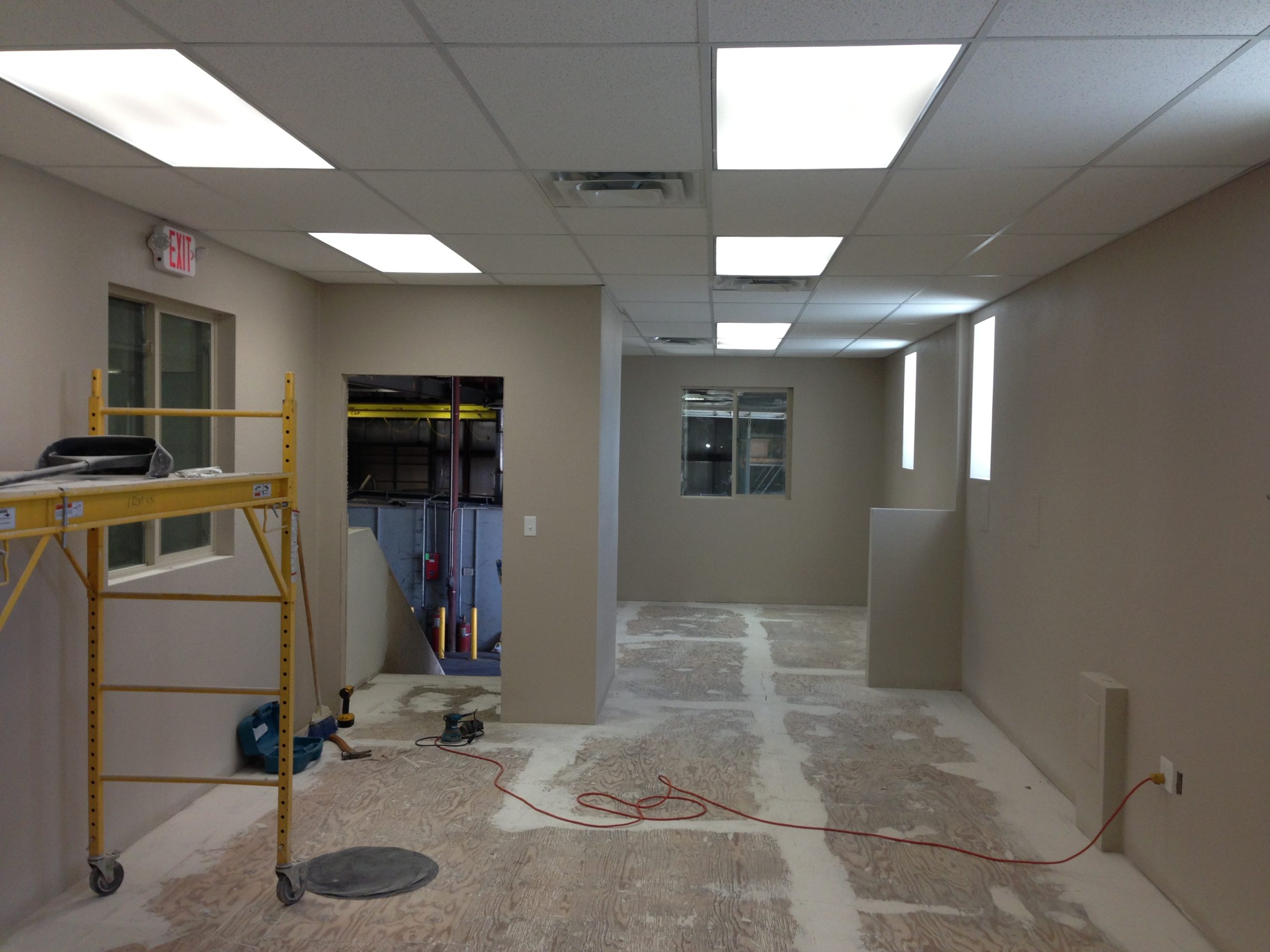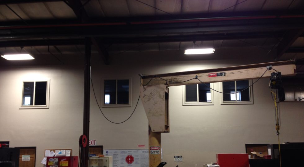 Design/Build – Renovation of 815 sf mezzanine into full finish offices and breakroom.  The new space was finished with drywall, paint, VCT flooring and 4″ rubber base, acoustical drop ceiling and fixed countertops for the workstations. Interior glazing was installed in the common wall of the new workspace on 2nd floor and the shop. The breakroom included casework and tying into the existing plumbing on first floor for the new breakroom sink and dishwasher. The expansion of tempered finish area required additional H.V.A.C., completed with a split system. Additional emergency egress exit was required in addition to existing staircase. New set of stairs was constructed of wood framing, finished with oak wall cap and handrail. Once on site the project scope expanded with owner driven additions, including upgrade warehouse, and covered loading area lighting.